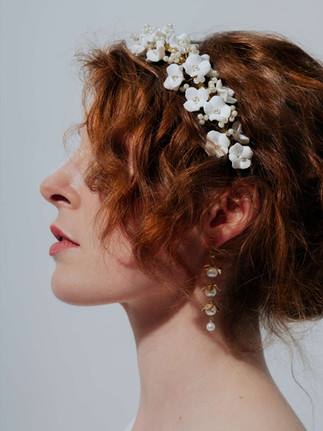 Chez Nahclay, certaines créations sur-mesure combinent perles Swarovski et fleurs en porcelaine froide, pour un bijou unique et harmonieux, reflet du style de la mariée.